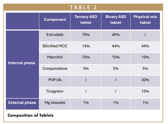 Building on this work, a 2025 study incorporated the most promising formulation into an oral tablet. A ternary ASD containing 14.3% ticagrelor, 21.4% Gelucire 48/16, and 64.3% PVPVA was successfully incorporated into a tablet formulation (Table 2).