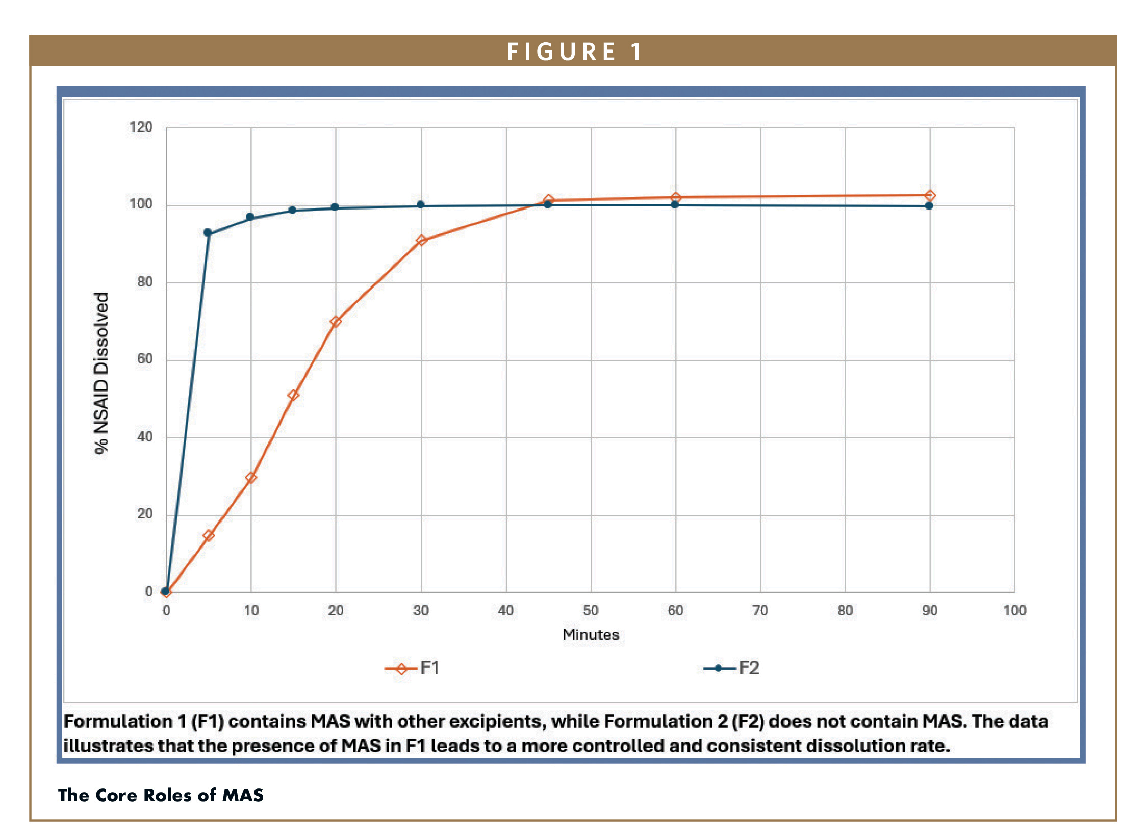 The unique challenges of formulating select NSAIDs, which are known for their poor solubility and bitter taste, provide a compelling use case for a novel excipient like MAS. Its high surface area (300 m3/gm) and porous structure facilitate the adsorption of the API at a near-molecular level, which enhances dispersion and prevents particle aggregation, thereby maximizing the drug’s exposure to gastrointestinal fluids and leading to a more consistent dissolution profile. Furthermore, MAS helps stabilize the amorphous form of the drug, preventing recrystallization and maintaining the controlled dissolution properties. For these NSAIDs, this stabilization can be the difference between a formulation that delivers a consistent and reproducible release profile and one that fails to achieve reliable results.