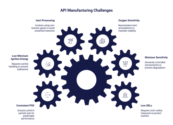 At the same time, the physicochemical profiles of modern APIs are increasingly complex. As depicted in Figure 1, a single compound may require nitrogen-inert processing, strict humidity control, protection from light and oxygen, and safeguards for low minimum ignition energy, all while maintaining extremely low exposure limits. Managing these requirements simultaneously has historically forced manufacturers into compromises that limit throughput, increase risk, or undermine reproducibility.